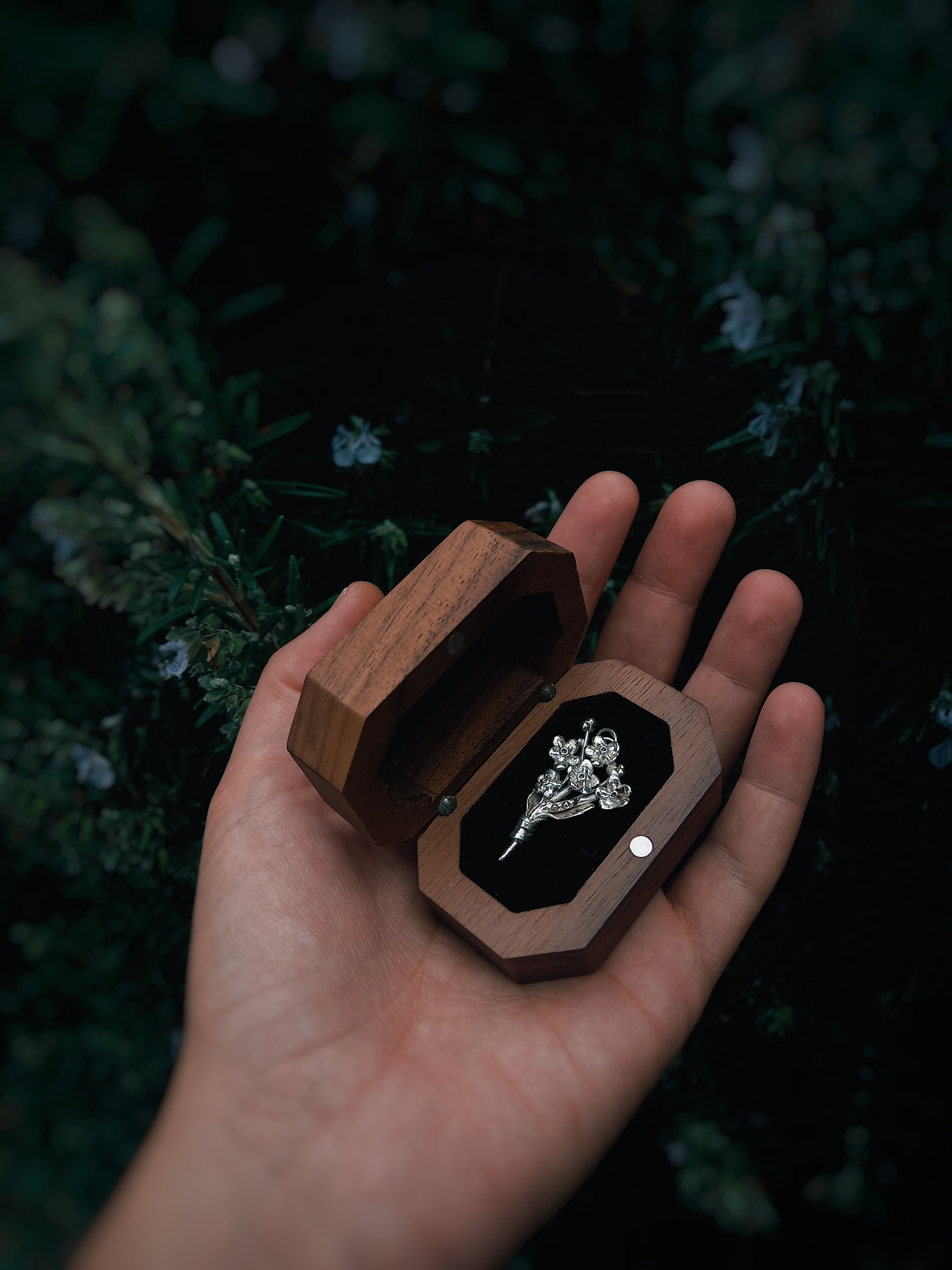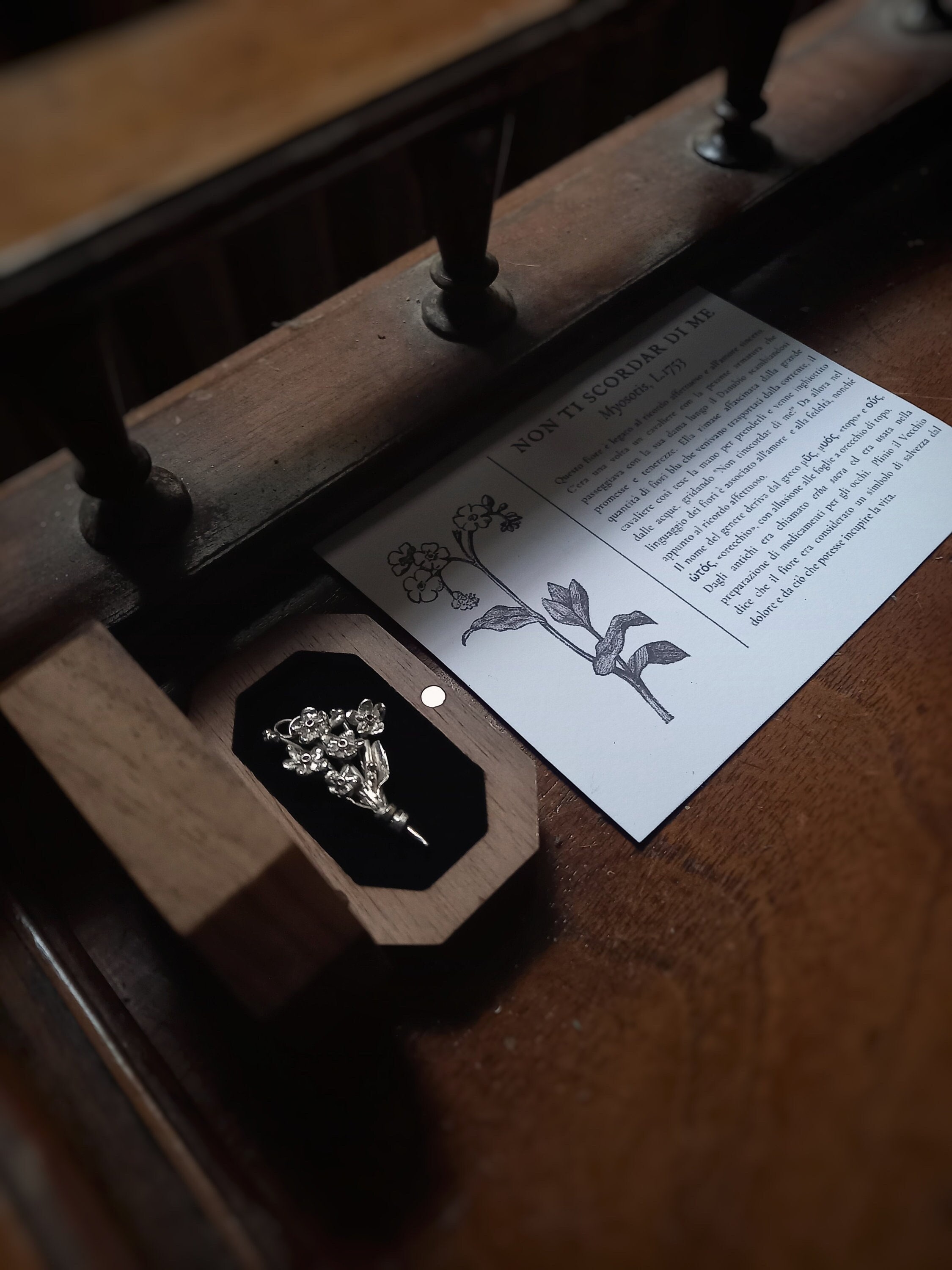 Ogni fiore viene custodito in una preziosa scatola di legno con interni in velluto nero e accompagnato da un biglietto dove vengono raccontate alcune curiosità ad esso legato.