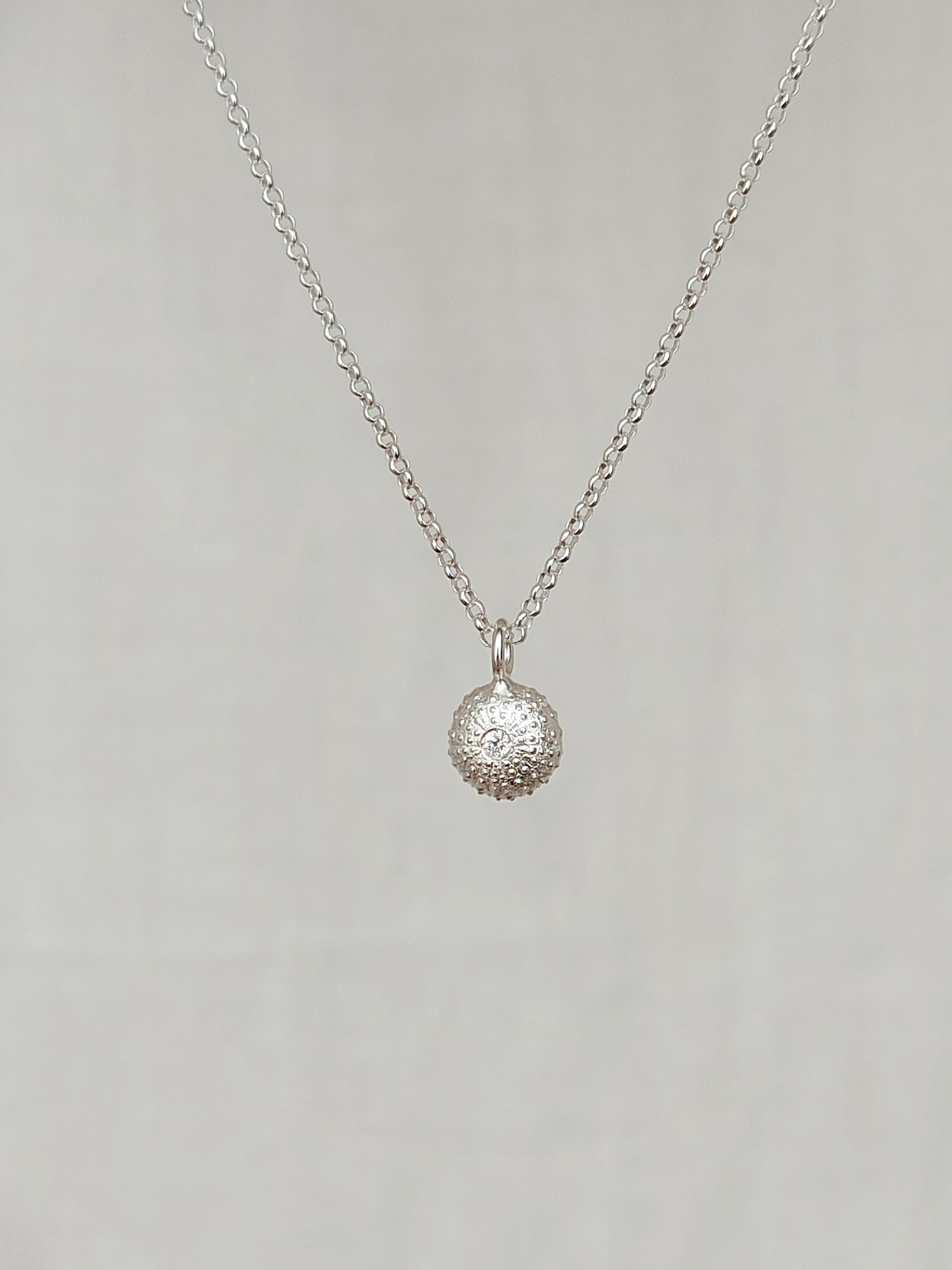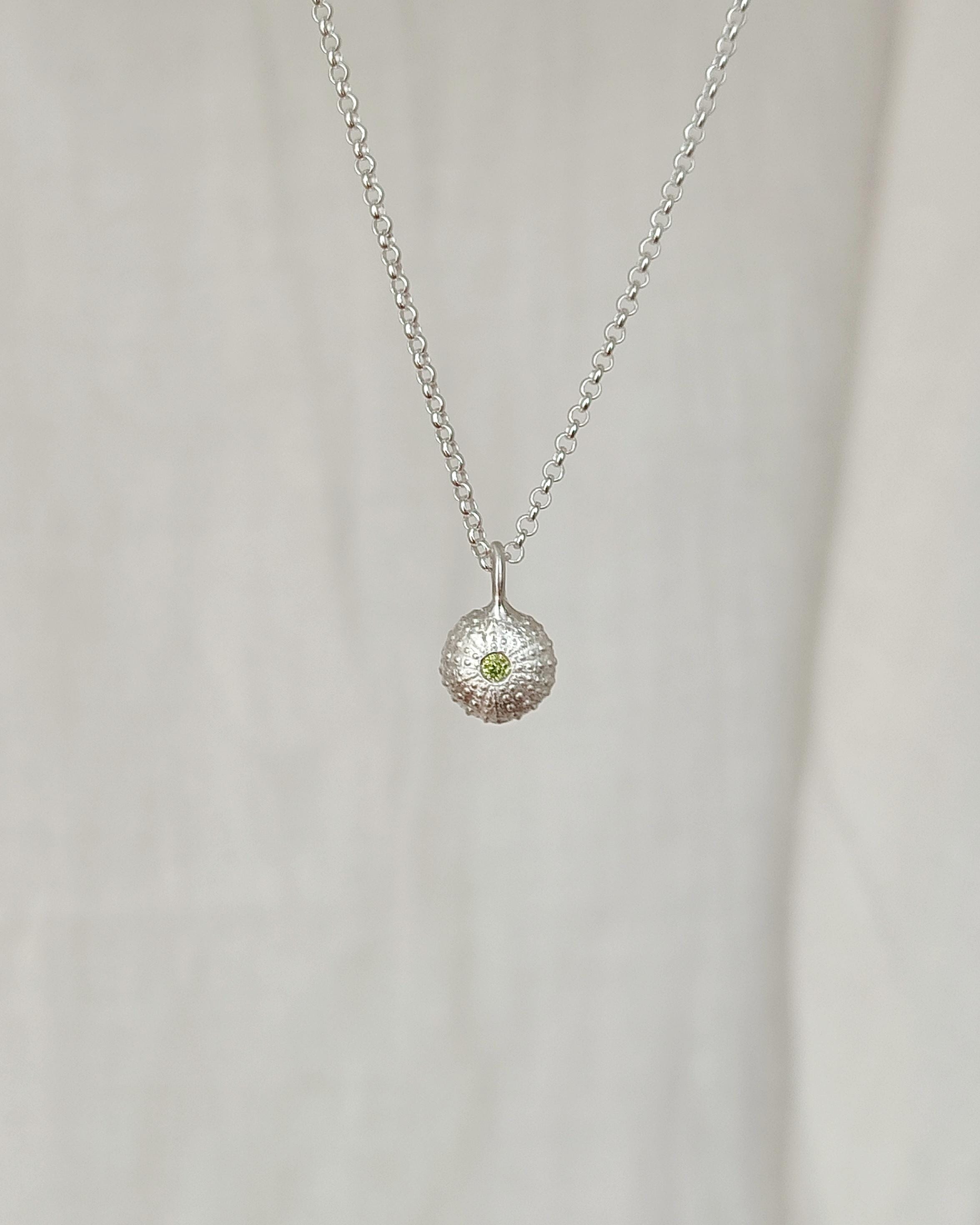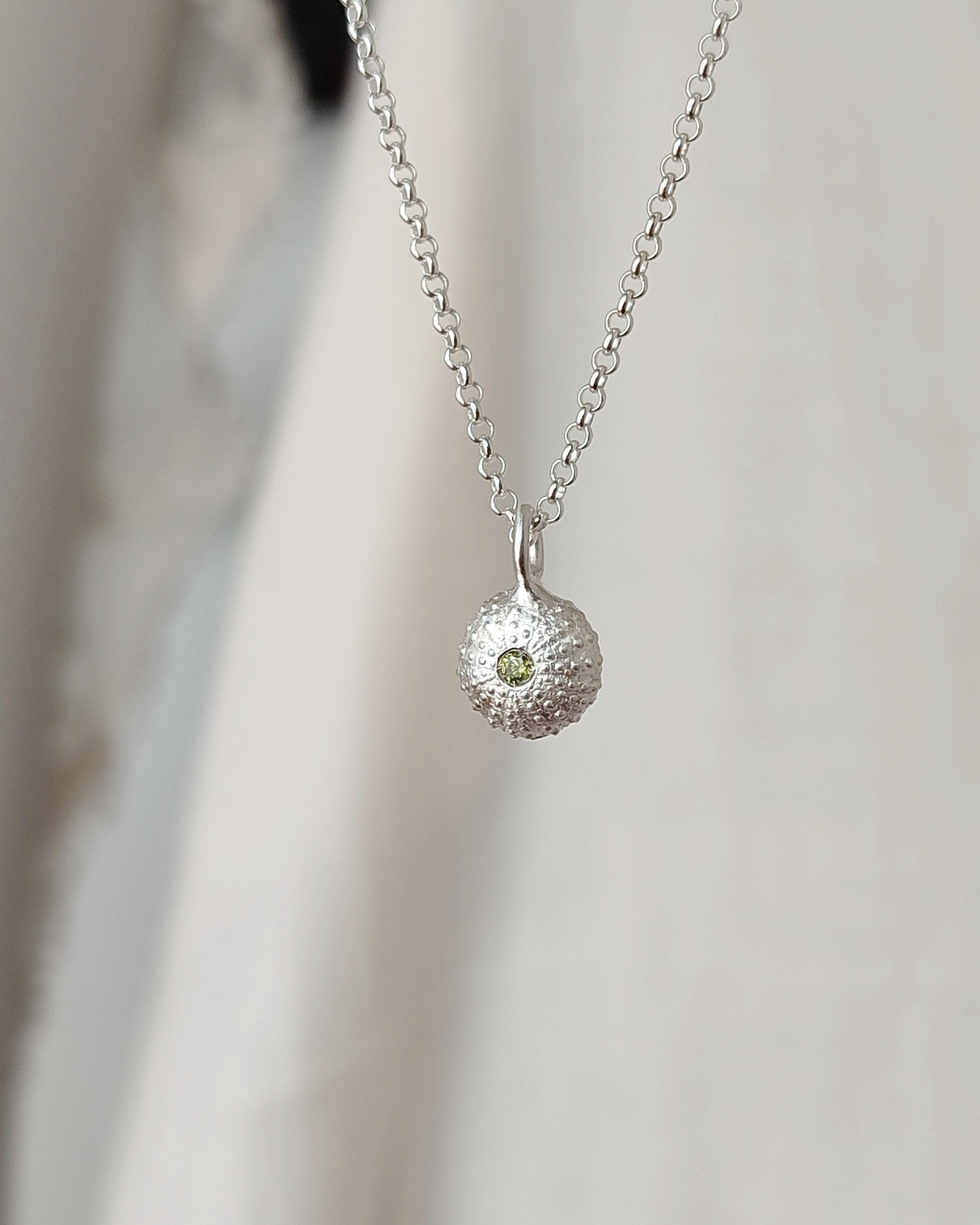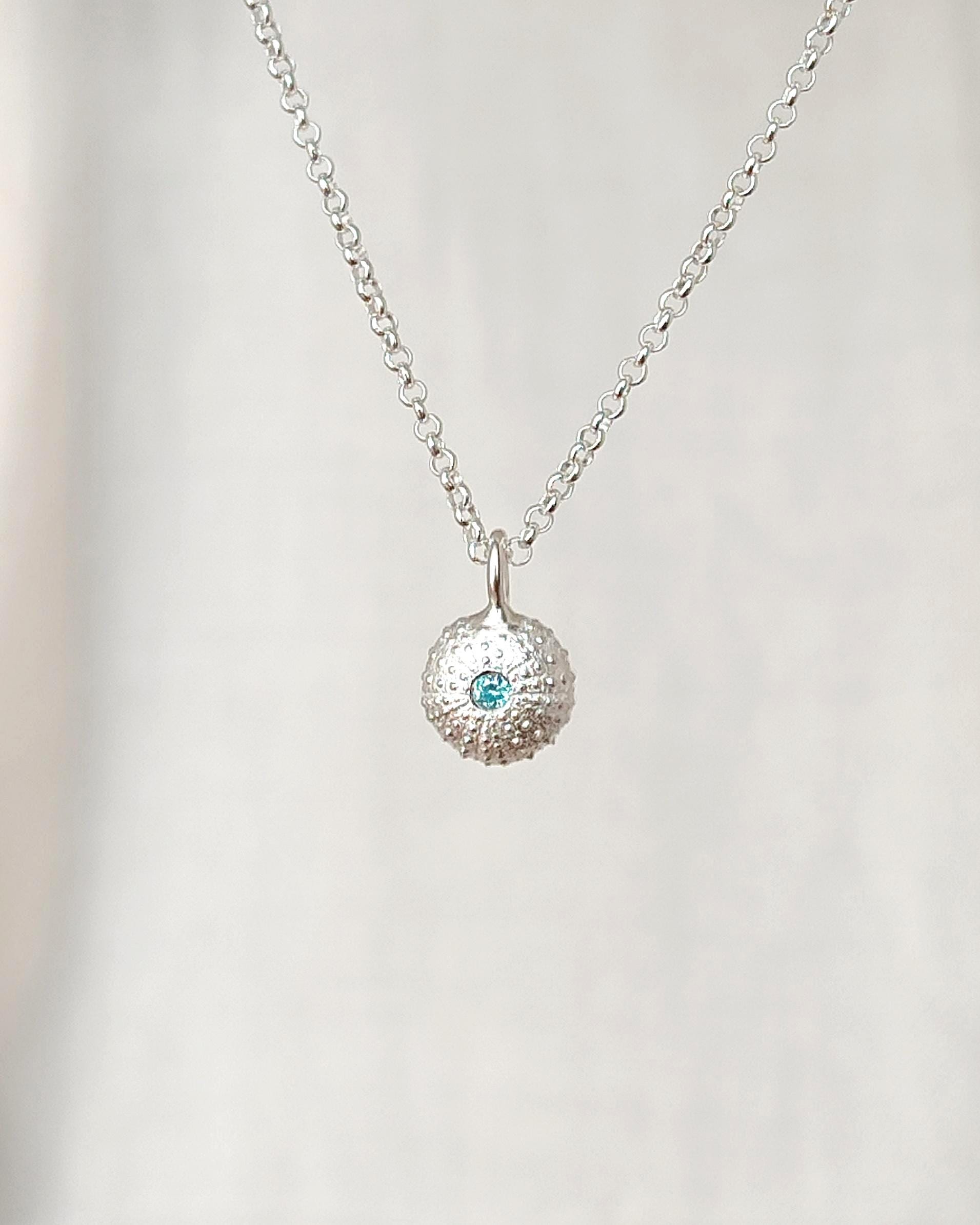 Il ciondolo che raffigura uno scheletro di riccio di mare è stato realizzato a partire da un vero riccio trovato in spiaggia poi fuso in argento 925. Successivamente viene impreziosito con l'incassatura di uno zircone colorato di alta qualità.