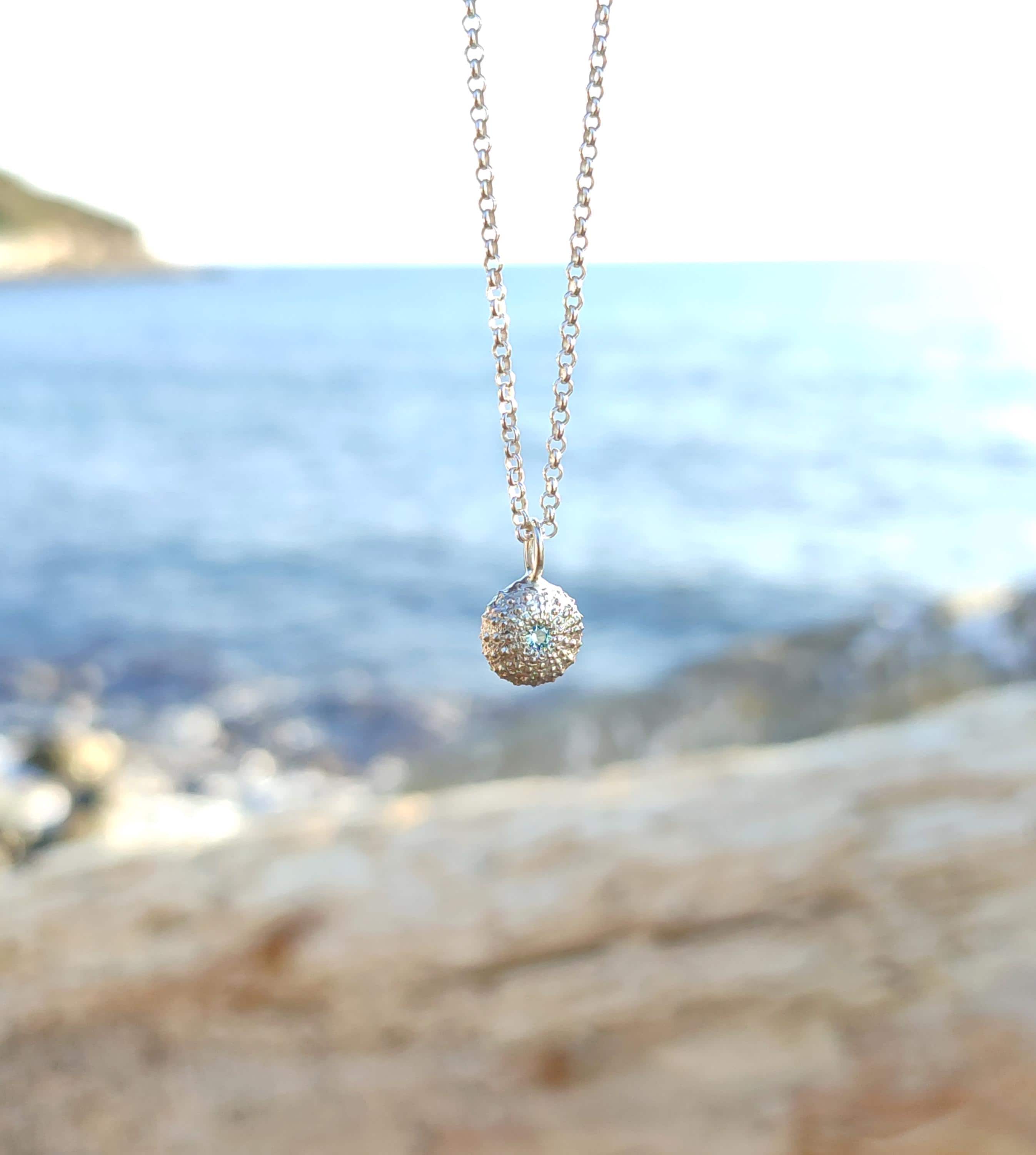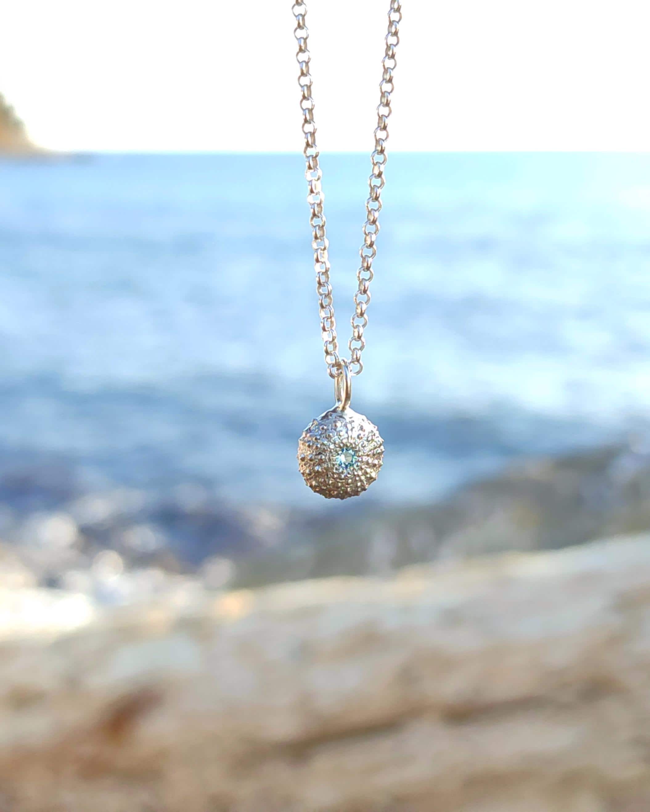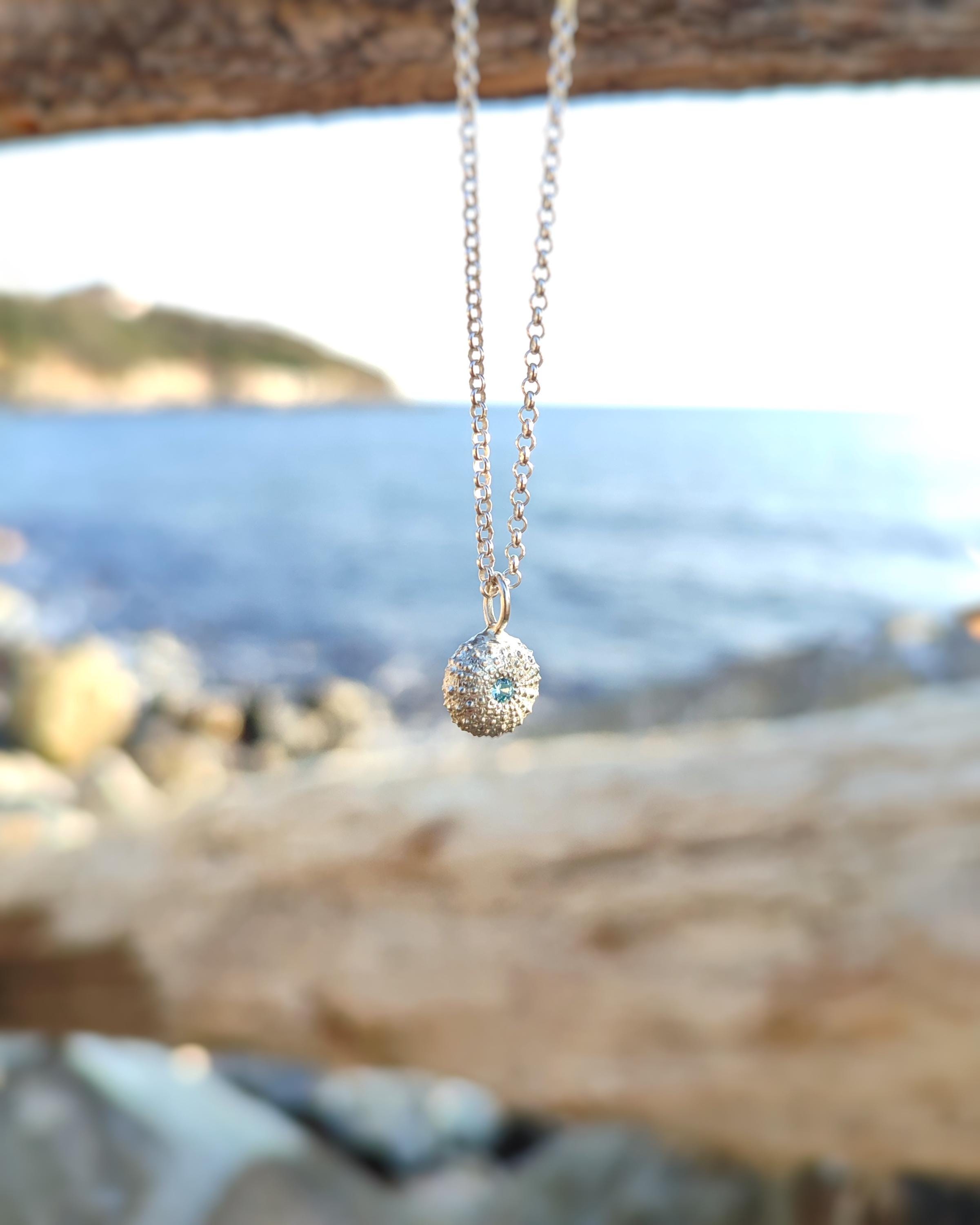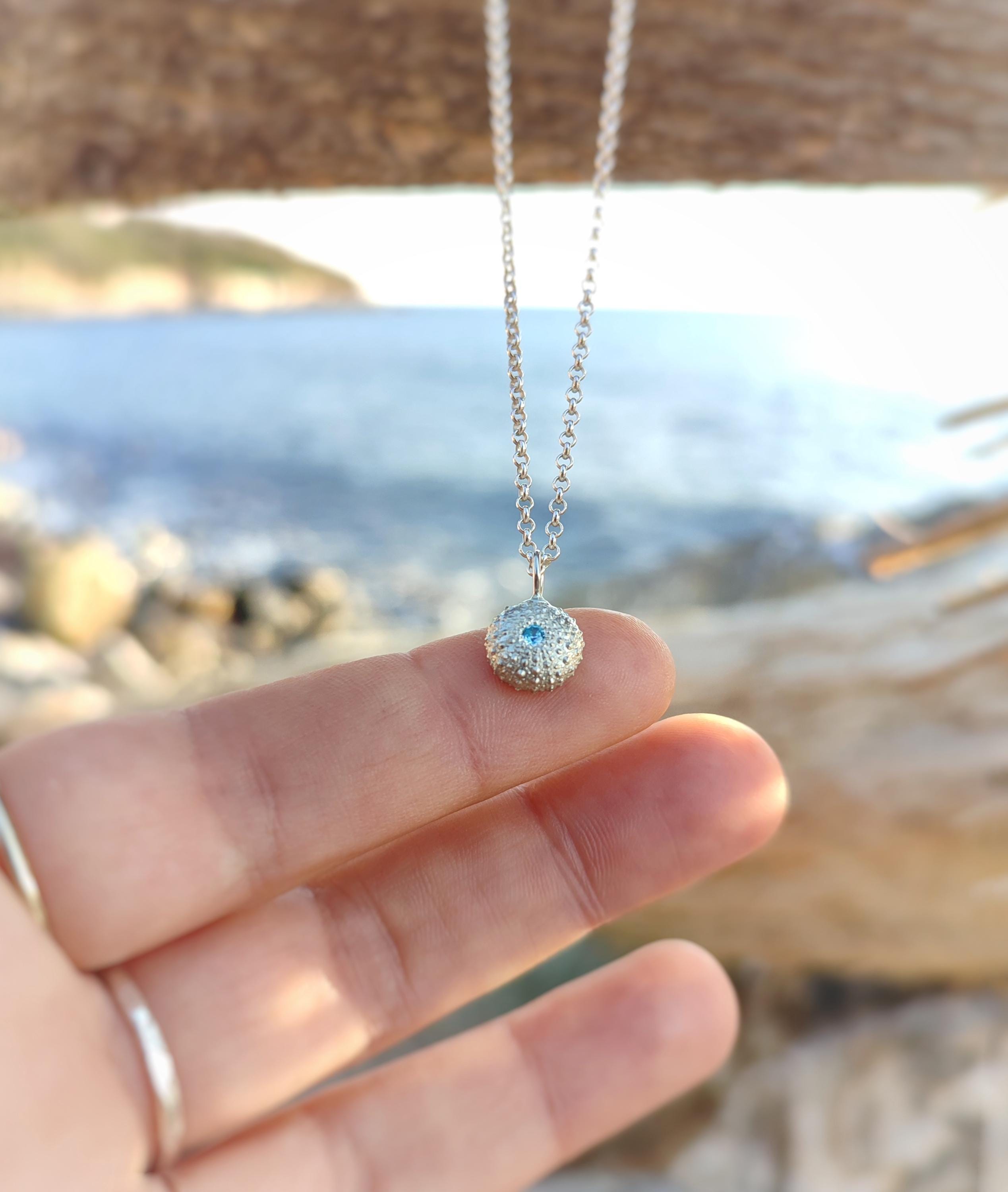 Il ciondolo che raffigura uno scheletro di riccio di mare è stato realizzato a partire da un vero riccio trovato in spiaggia poi fuso in argento 925. Successivamente viene impreziosito con l'incassatura di uno zircone celeste di alta qualità.