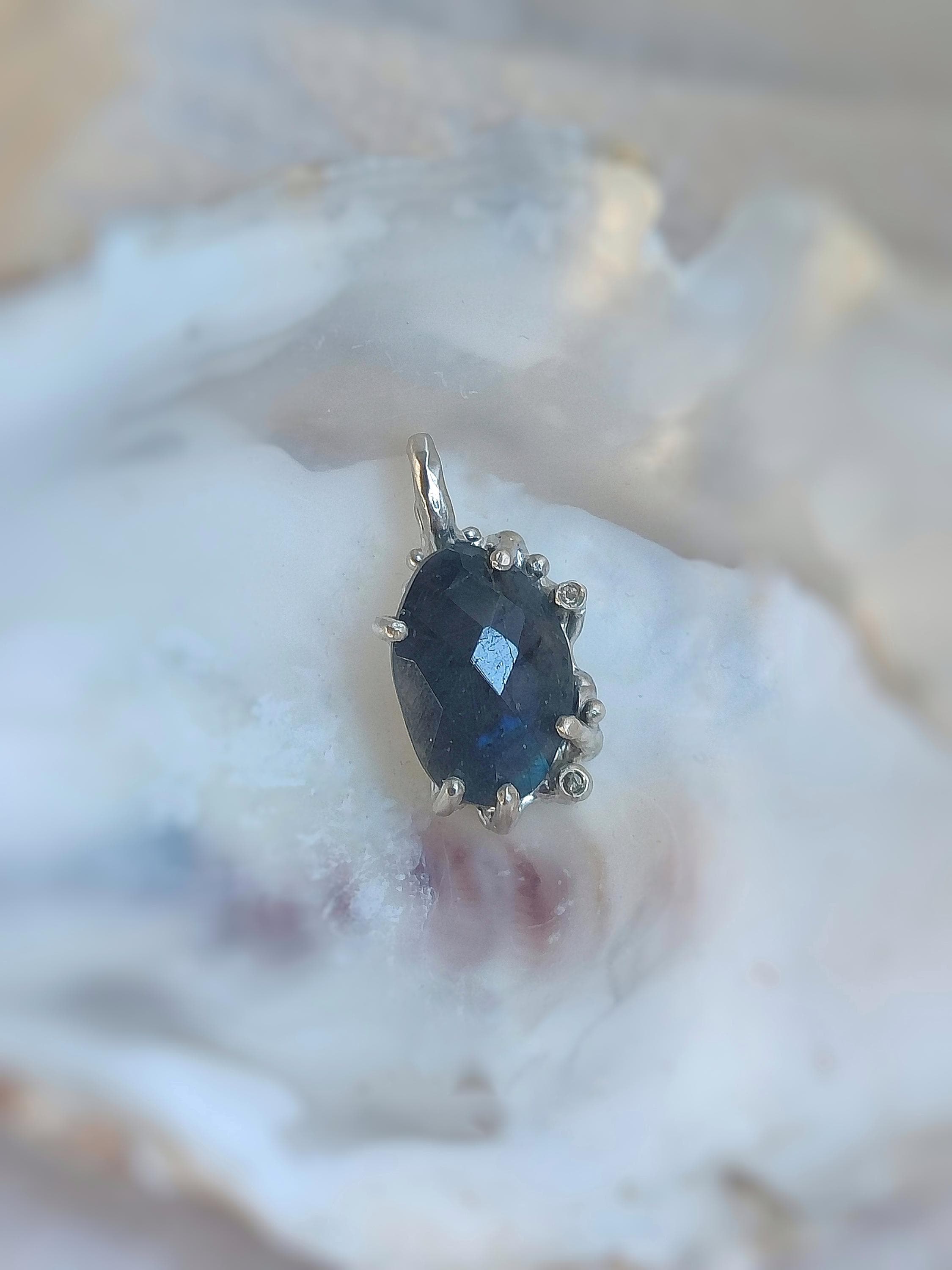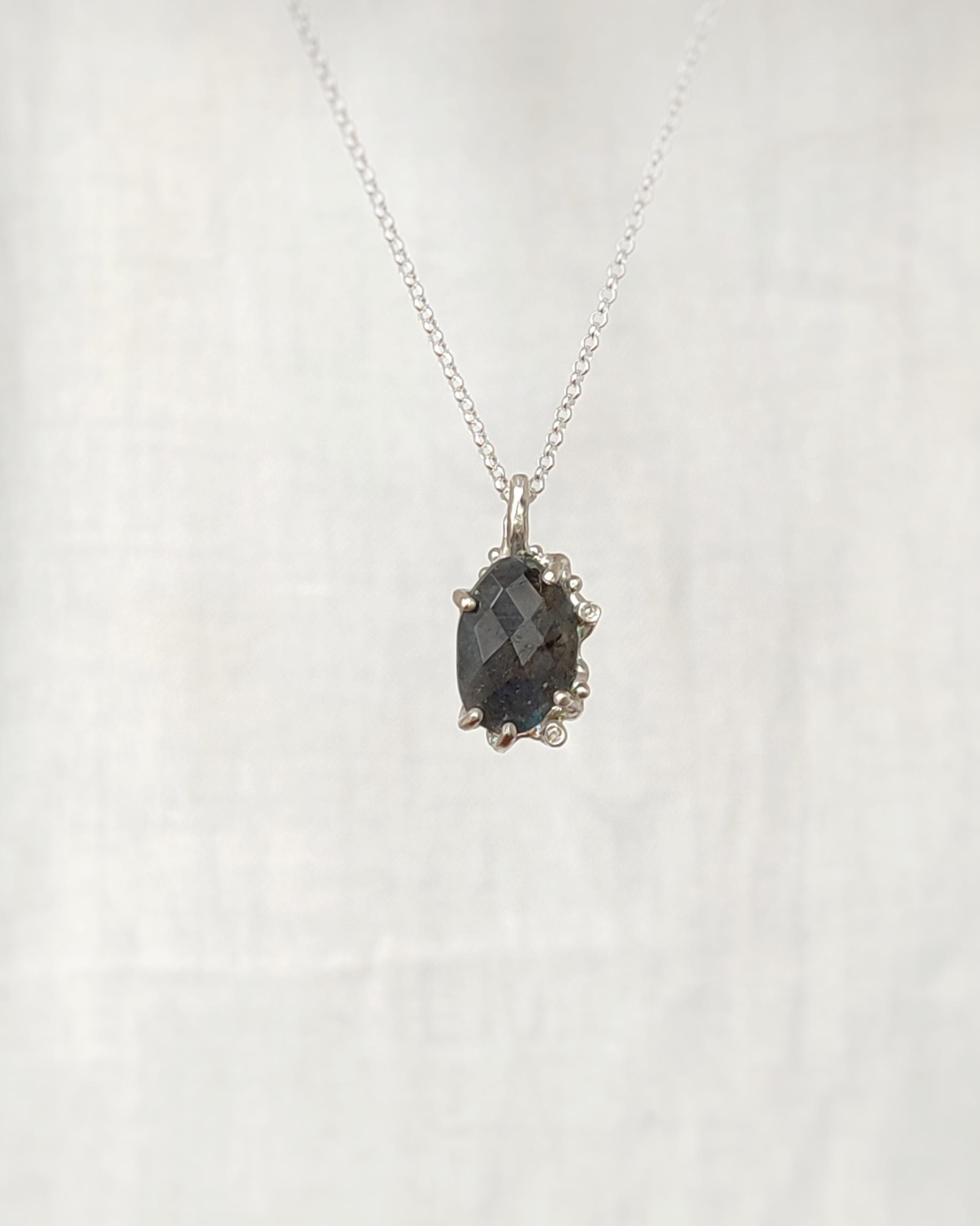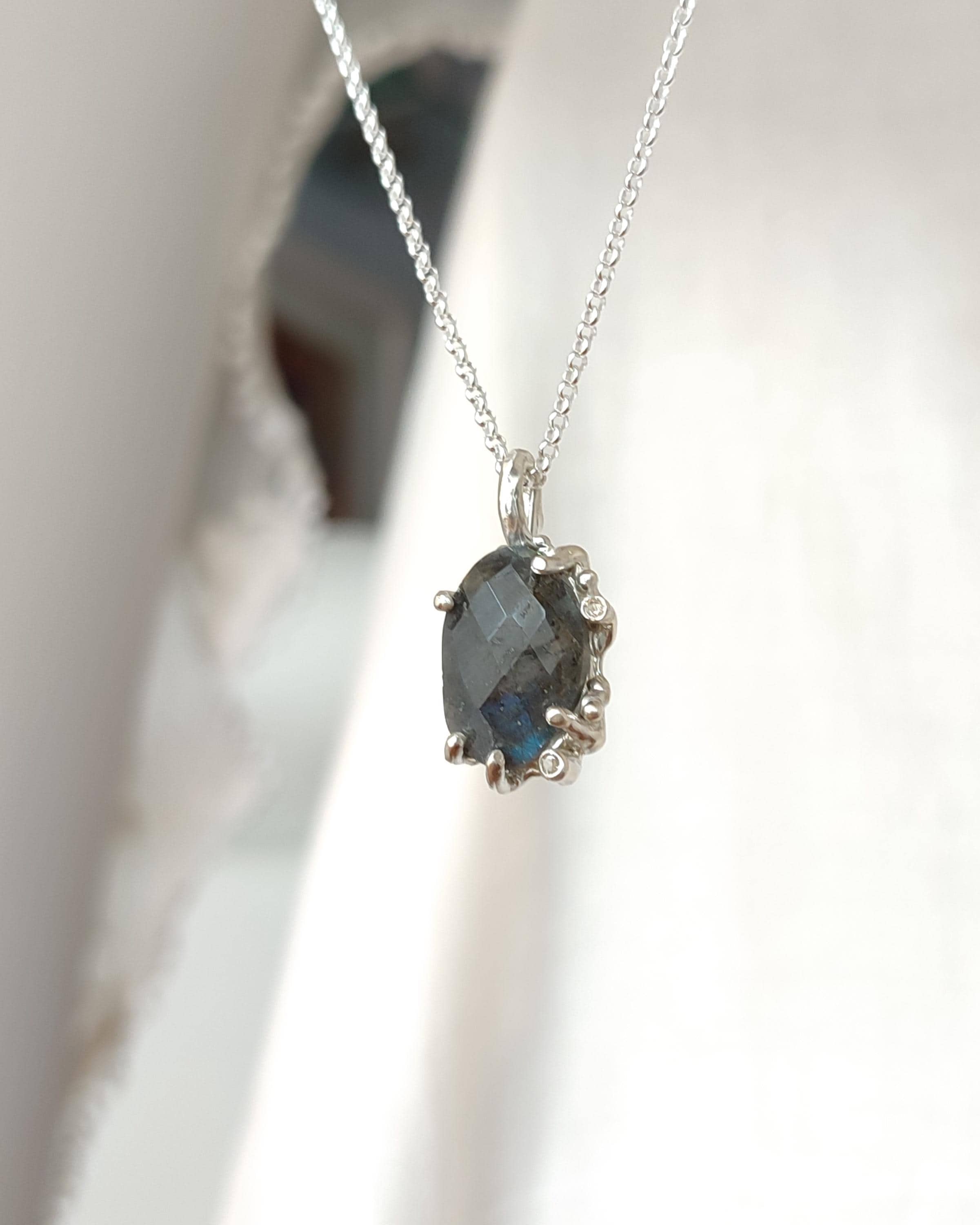 ***Questa collana è stata fatta a mano modellando la cera intorno a una pietra Labradorite taglio cabochon sfaccettato. Il pendente è impreziosito da due diamanti di alta qualità (Dimensione diamante singolo: circa 1 mm taglio rosetta retro piatto, 0,003 ct) . Successivamente viene fusa in argento 925 presso un laboratorio fiorentino con l'antica tecnica della fusione a cera persa. La catena è in argento 925.
