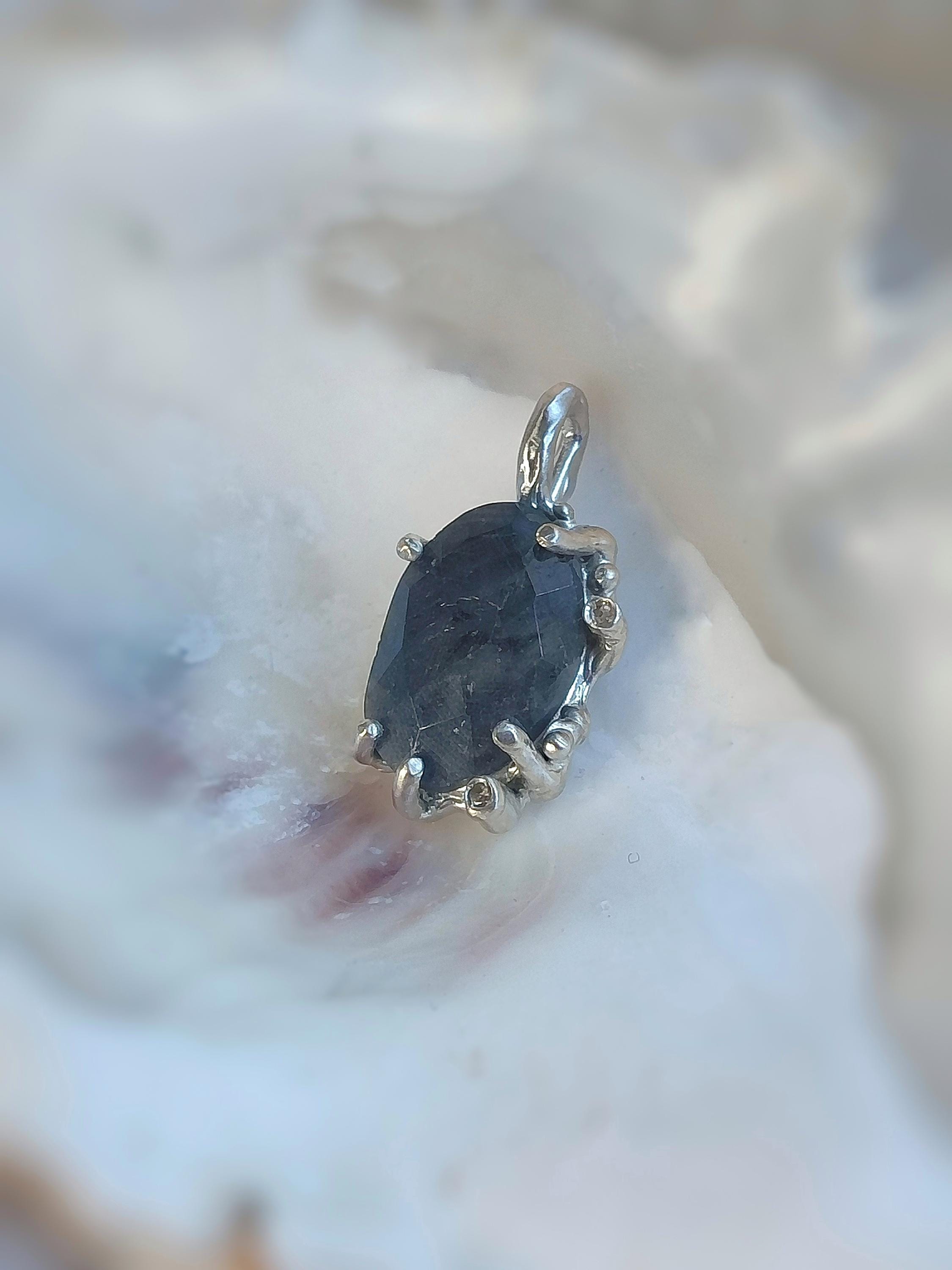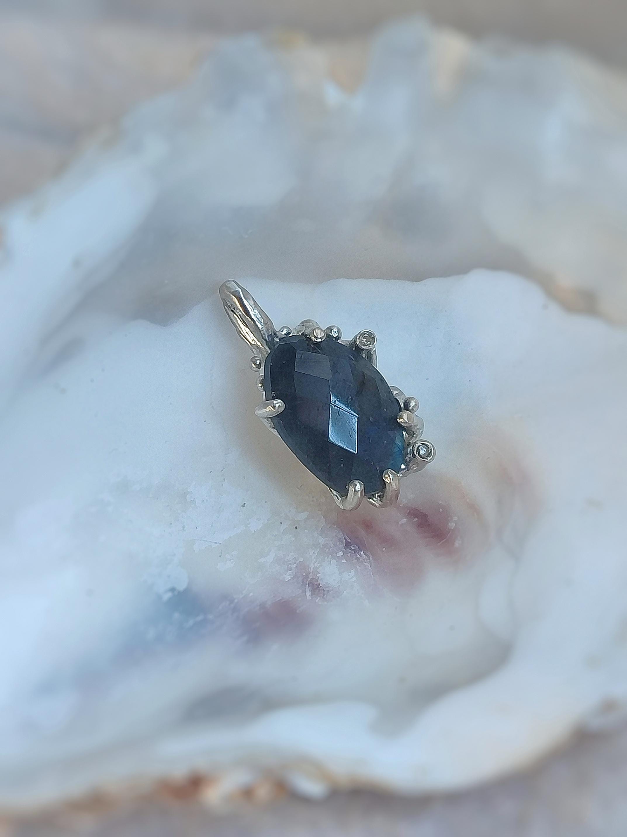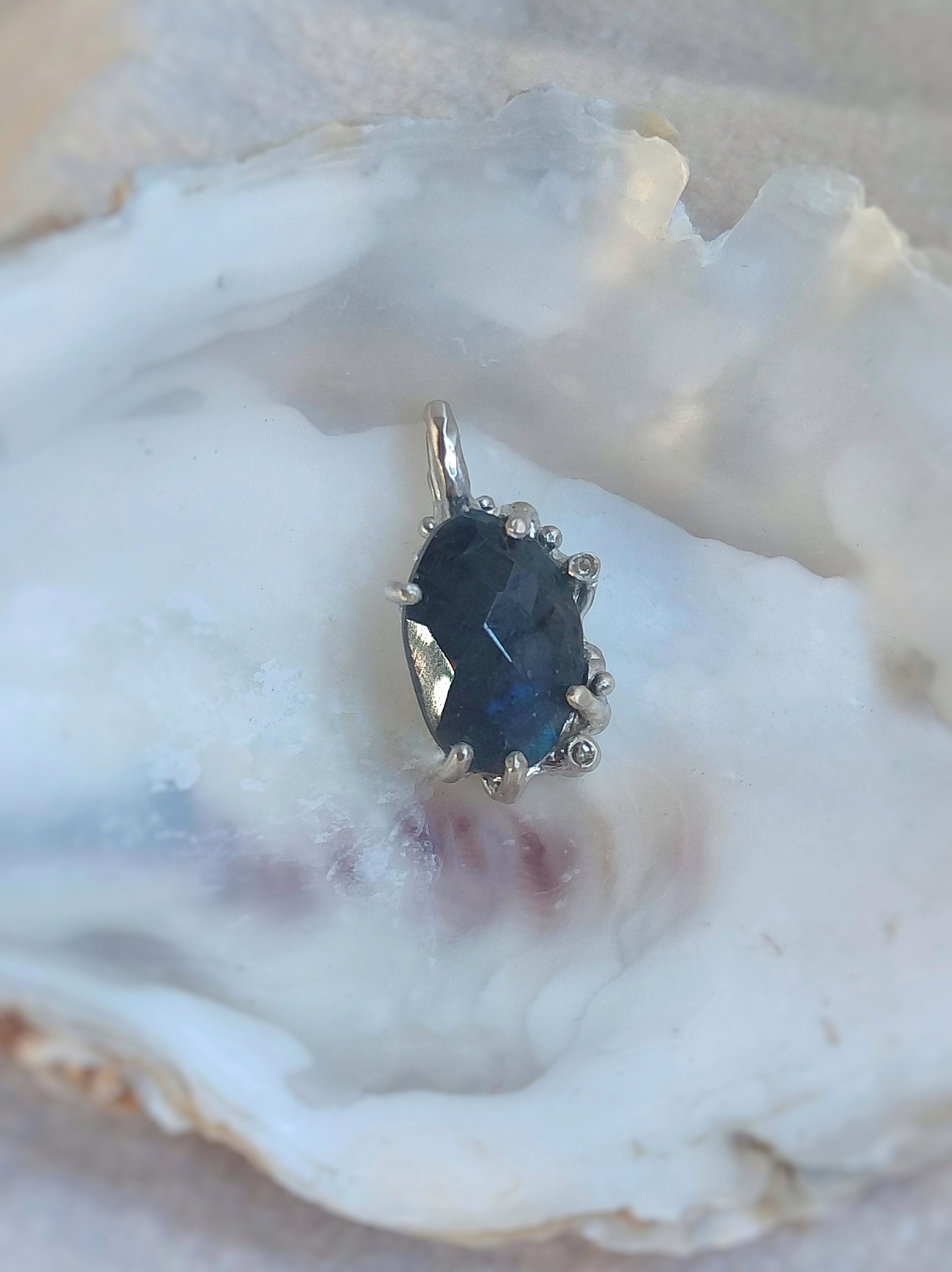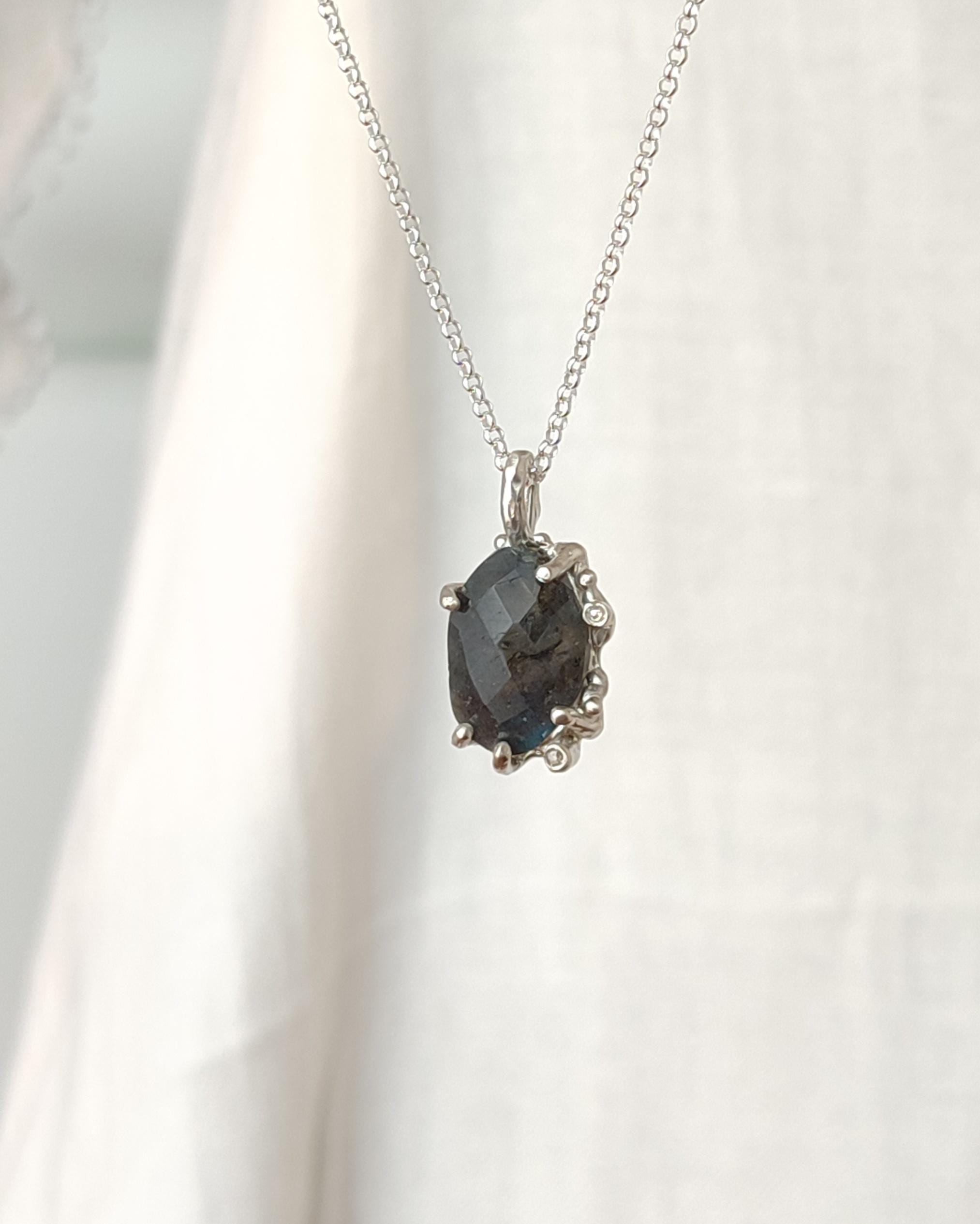 ***Questa collana è stata fatta a mano modellando la cera intorno a una pietra Labradorite taglio cabochon sfaccettato. Il pendente è impreziosito da due diamanti di alta qualità (Dimensione diamante singolo: circa 1 mm taglio rosetta retro piatto, 0,003 ct) . Successivamente viene fusa in argento 925 presso un laboratorio fiorentino con l'antica tecnica della fusione a cera persa. La catena è in argento 925.
