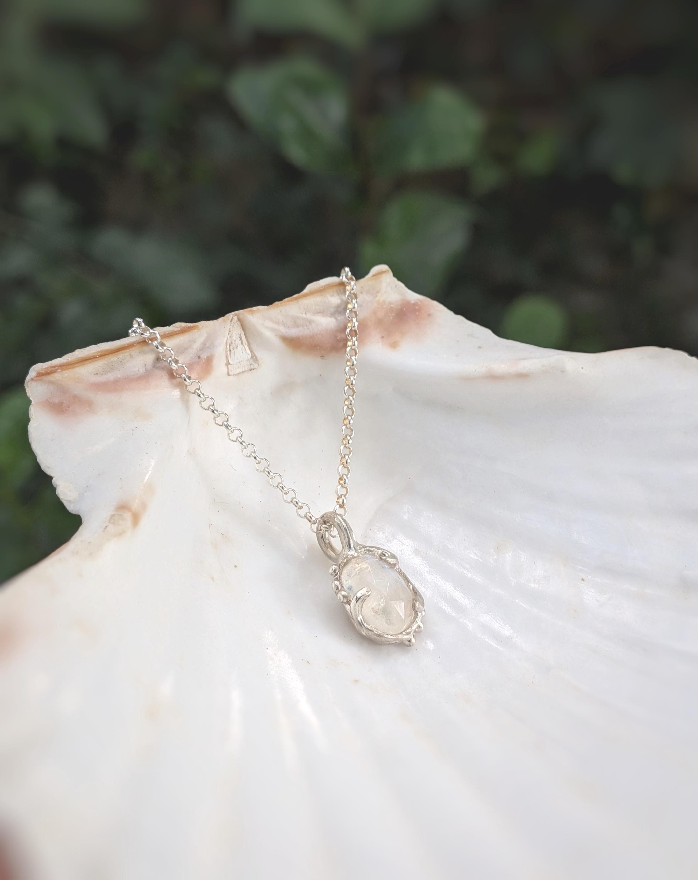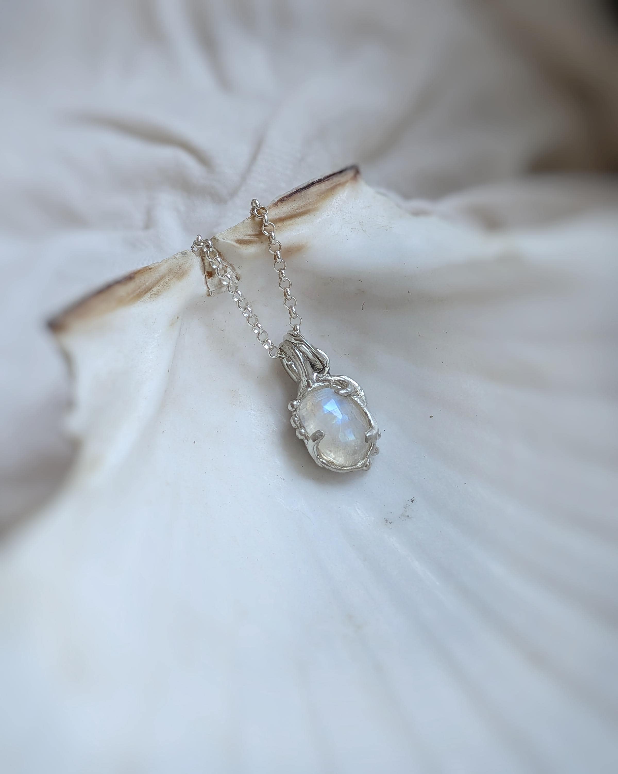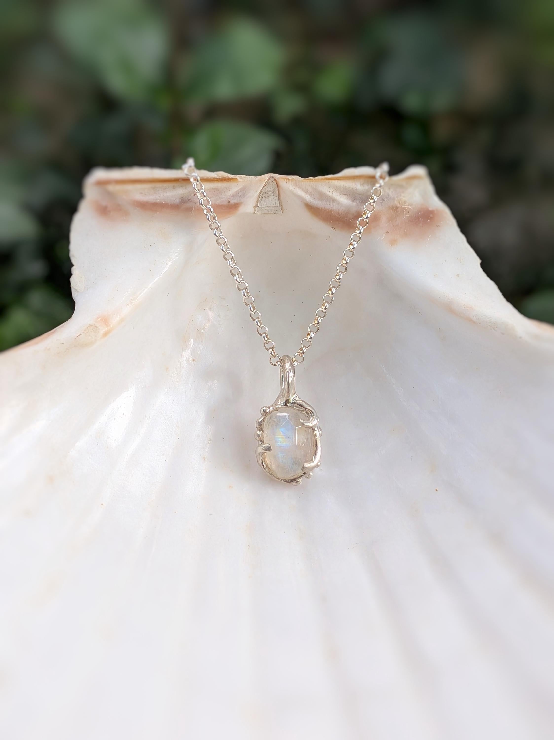 ***Questa collana è stata fatta a mano modellando la cera intorno a una pietra Rainbow Moonstone taglio cabochon sfaccettato. Successivamente viene fusa in argento 925 presso un laboratorio fiorentino con l'antica tecnica della fusione a cera persa. La catena è in argento 925.
