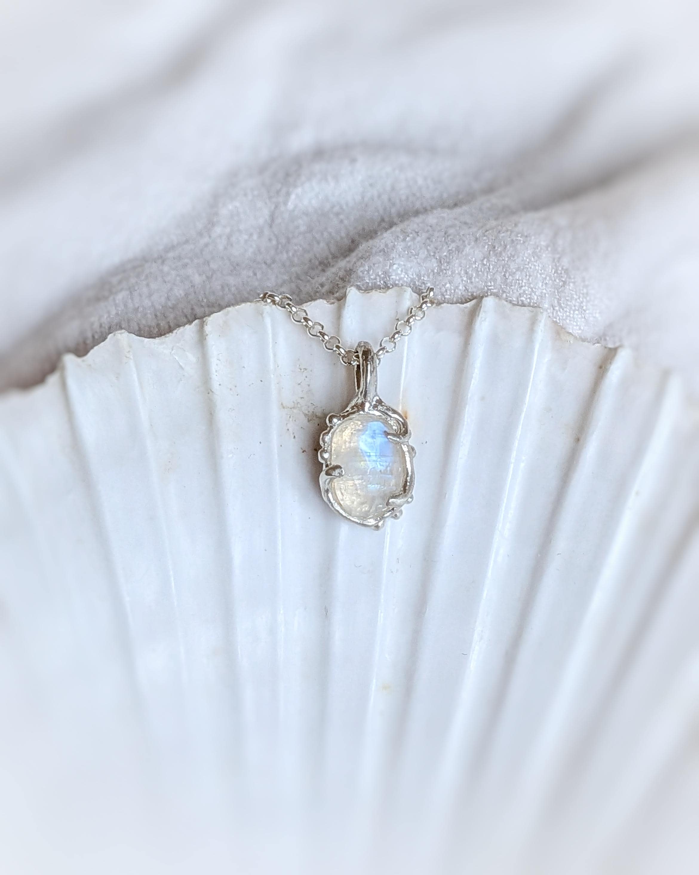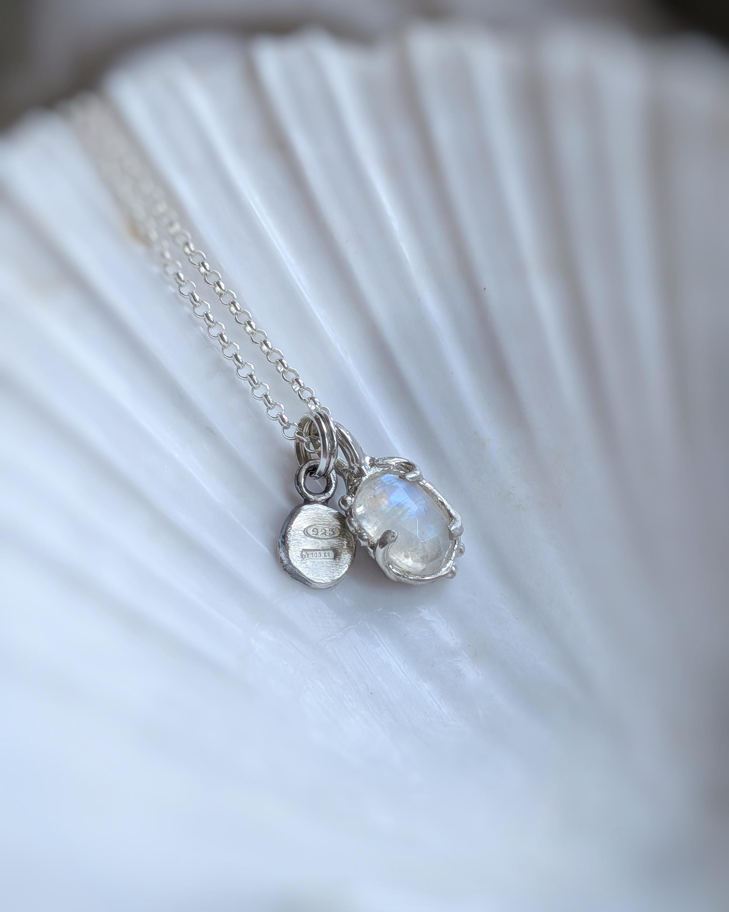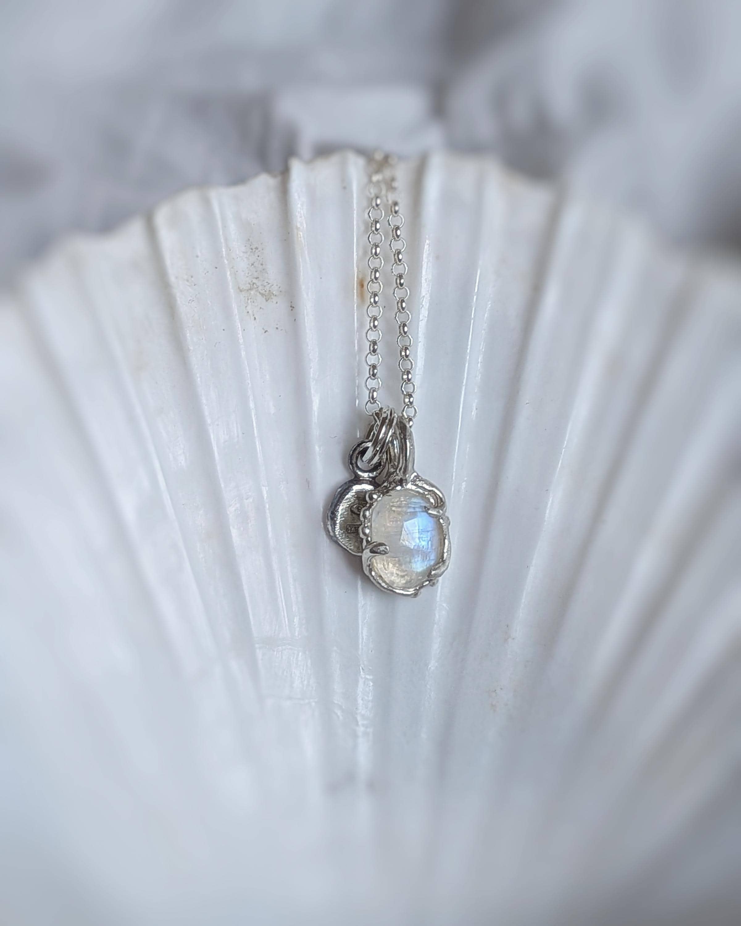 ***Questa collana è stata fatta a mano modellando la cera intorno a una pietra Rainbow Moonstone taglio cabochon sfaccettato. Successivamente viene fusa in argento 925 presso un laboratorio fiorentino con l'antica tecnica della fusione a cera persa. La catena è in argento 925.