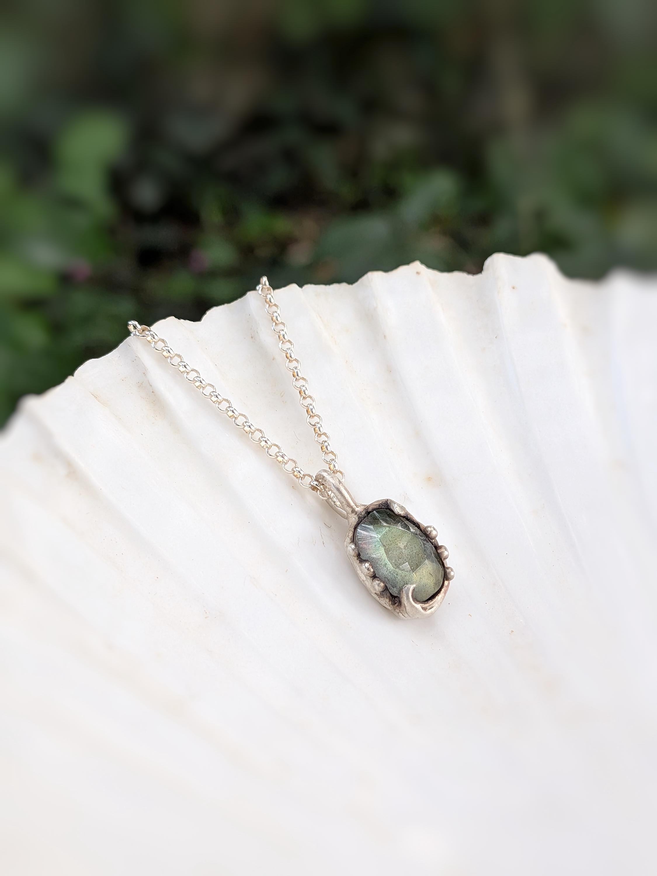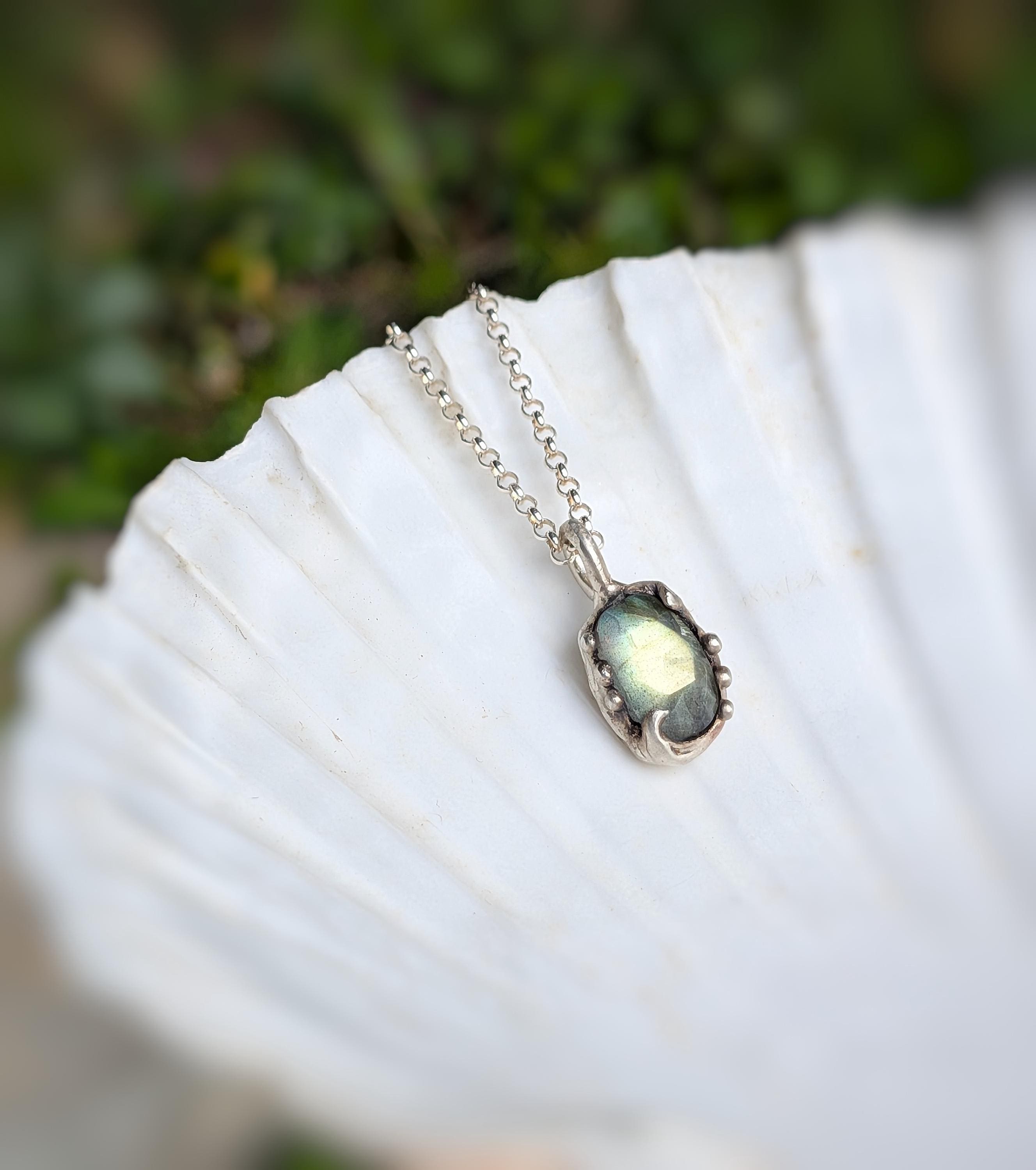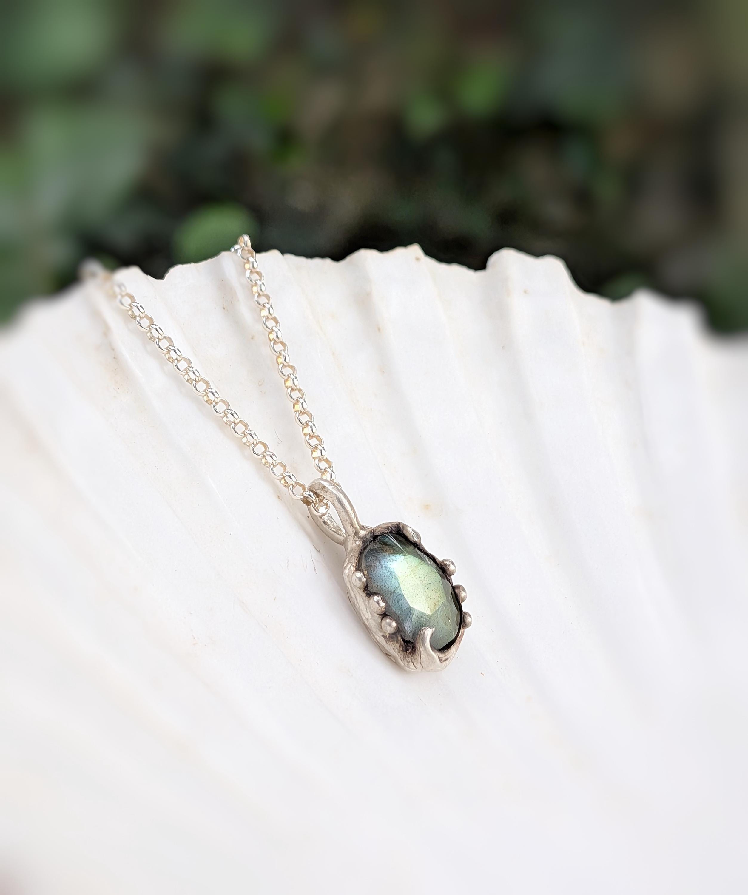 ***Questa collana è stata fatta a mano modellando la cera intorno a una pietra Labradorite taglio cabochon sfaccettato. Successivamente viene fusa in argento 925 presso un laboratorio fiorentino con l'antica tecnica della fusione a cera persa. La catena è in argento 925.