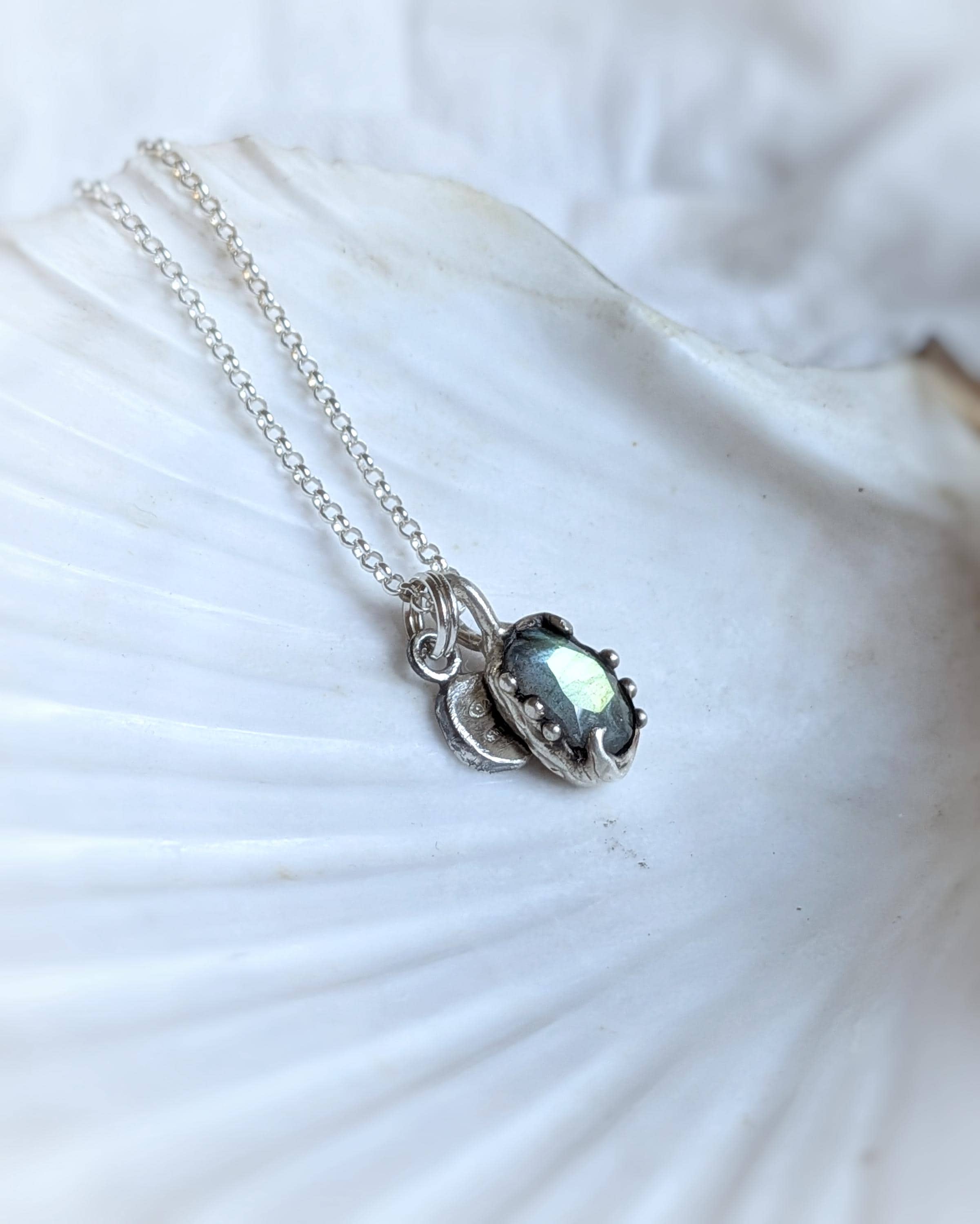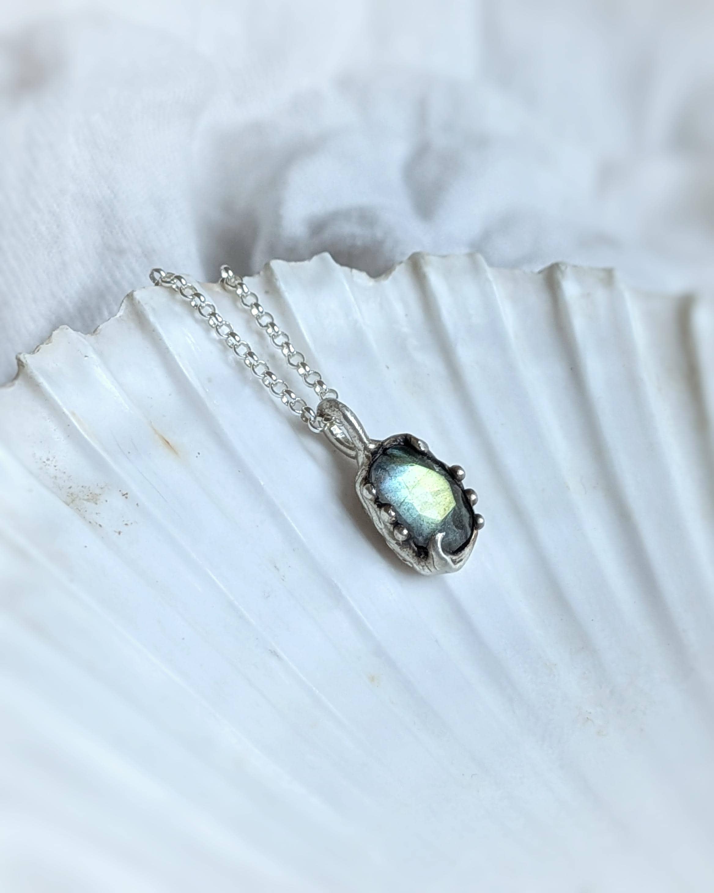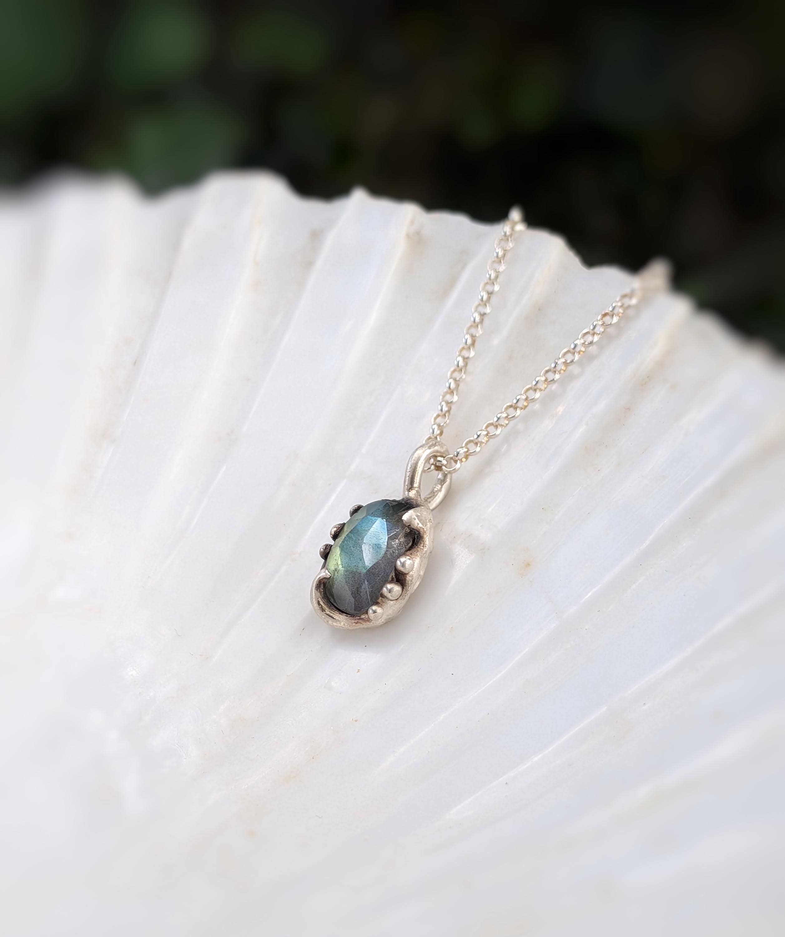 ***Questa collana è stata fatta a mano modellando la cera intorno a una pietra Labradorite taglio cabochon sfaccettato. Successivamente viene fusa in argento 925 presso un laboratorio fiorentino con l'antica tecnica della fusione a cera persa. La catena è in argento 925.